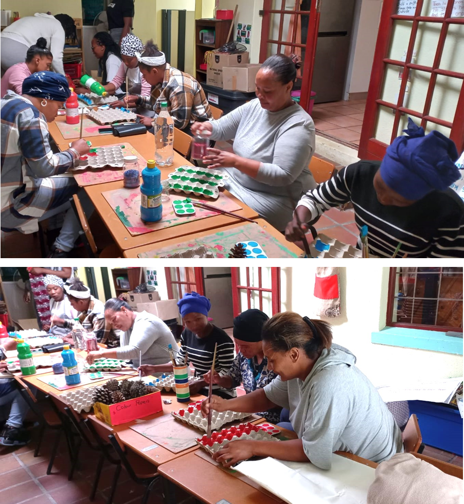 Staff had work tables set out with paints and craft material and the parents enthusiastically got down to the task, colours flowed while staff provided encouragement and advice. There was lots of chatter and laughter about being like children again and having to create something. Parents became so absorbed in painting that the one mother dipped her paint brush in her tea mug and everyone had a good laugh. It was wonderful for our parents to feel like children again and have some fun and create something beautiful. When asked if they would like to have more craft sessions the overwhelming response was; ‘Yes, because it was so nice and calming’. When the parents climbed into the Educare bus for the trip back home again they were in high spirits, one mom had even cheekily painted her initials in green on the side of her face and added some glitter.